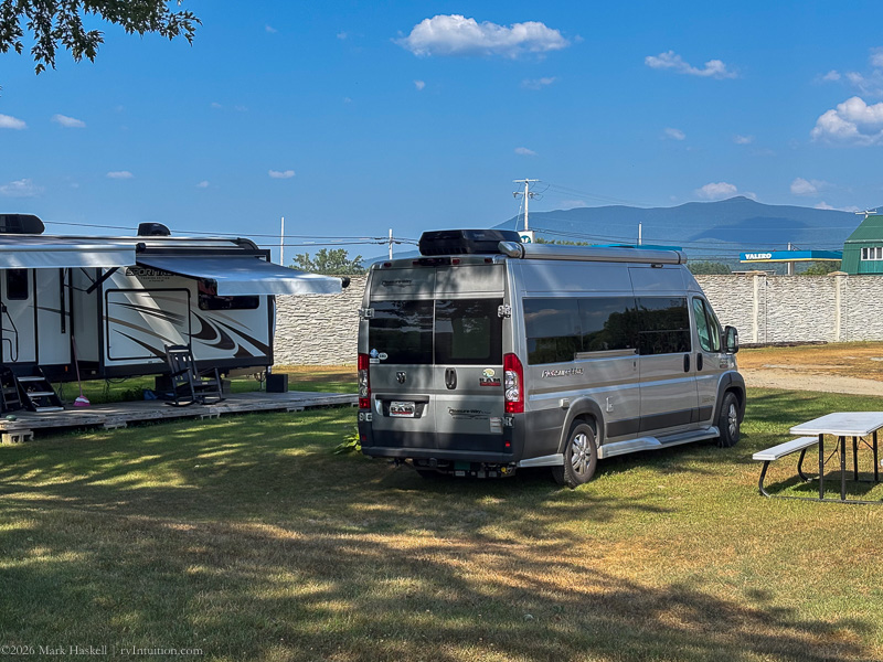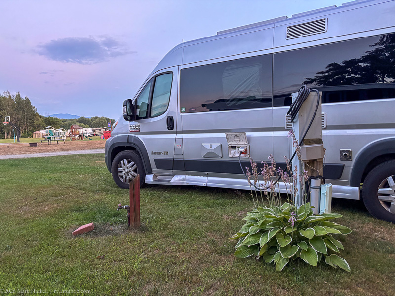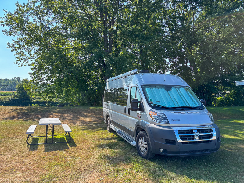 We had site #2. All sites have full hook-ups. There is a service station behind that wall, but we weren’t bothered by noise overnight. We had a view of the river and the sunset from inside the van.