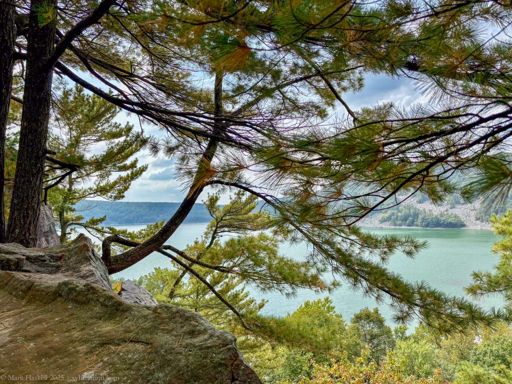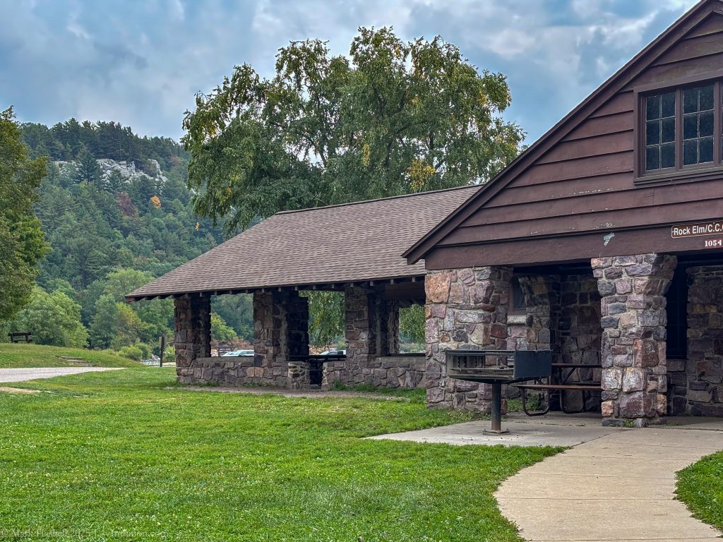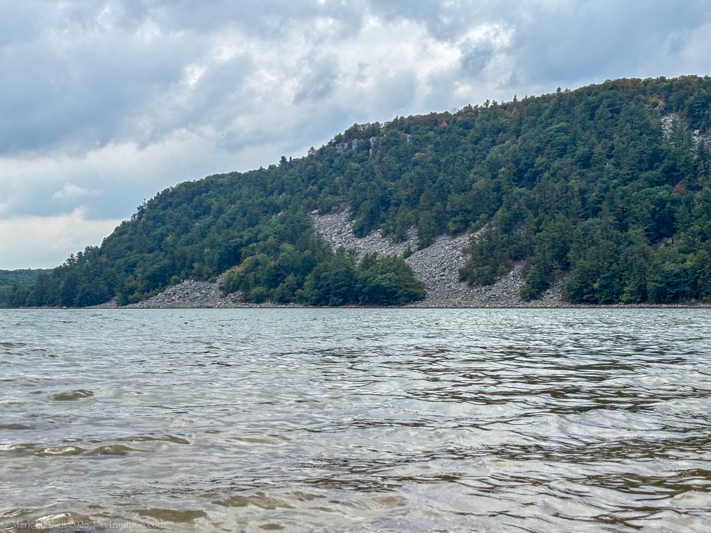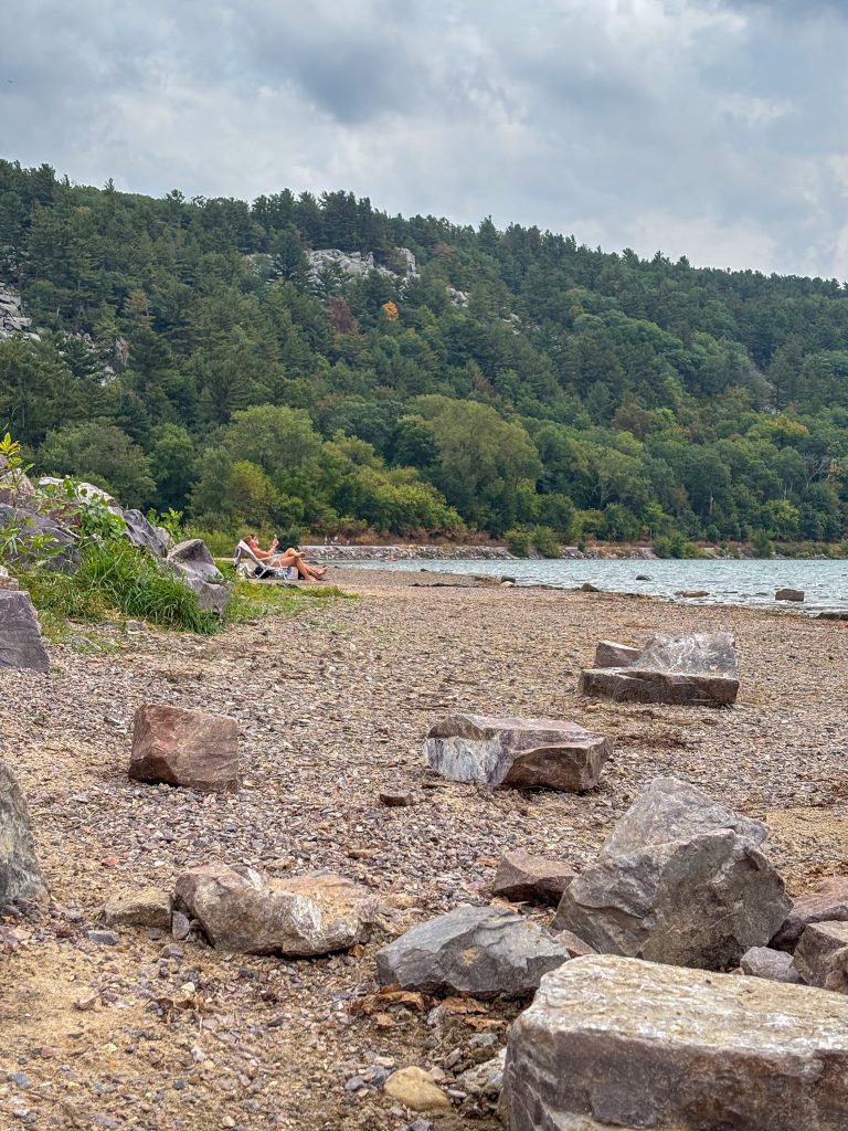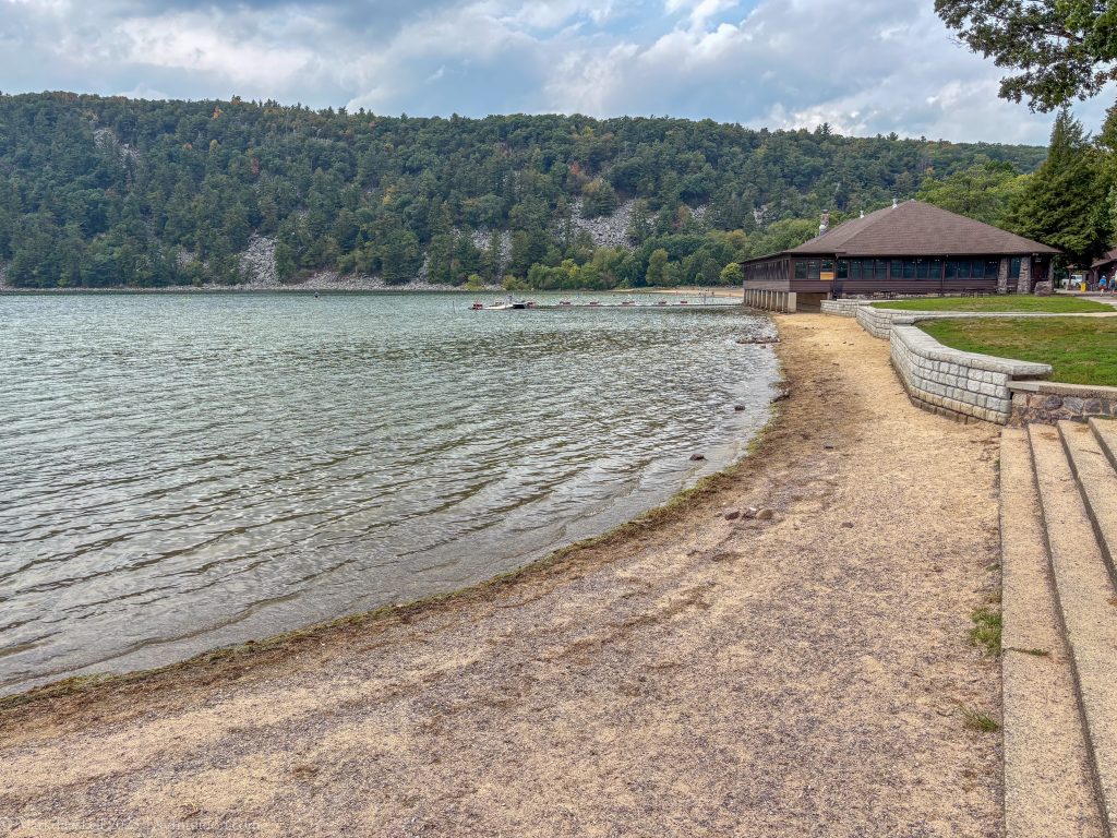 There isn’t camping at the South Shore, but there is a nice beach, picnic area, and trail access. We were curious to know more about the lake, so researched the source as spring fed and the depth at 47 feet. Thinking it might have been a quarry, we found that some of the stone had been cut from the bluffs, but the lake was naturally formed by glaciers. The rise from the lake to the top of the quartzite bluffs is five-hundred feet.