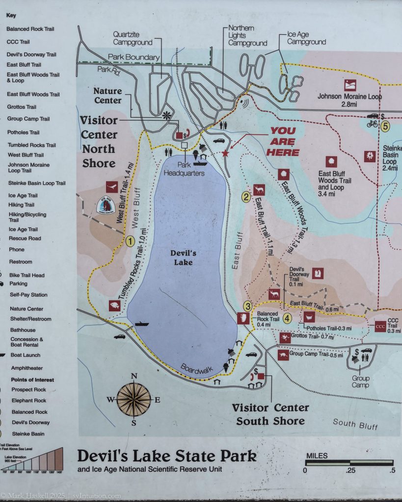 On Friday it was time to dump and fill our tanks, so we used that excuse to visit Devil’s Lake State Park. Only about an hour north of Madison, the park is just south of Baraboo. Here are a few photos to give you a feel for the park.