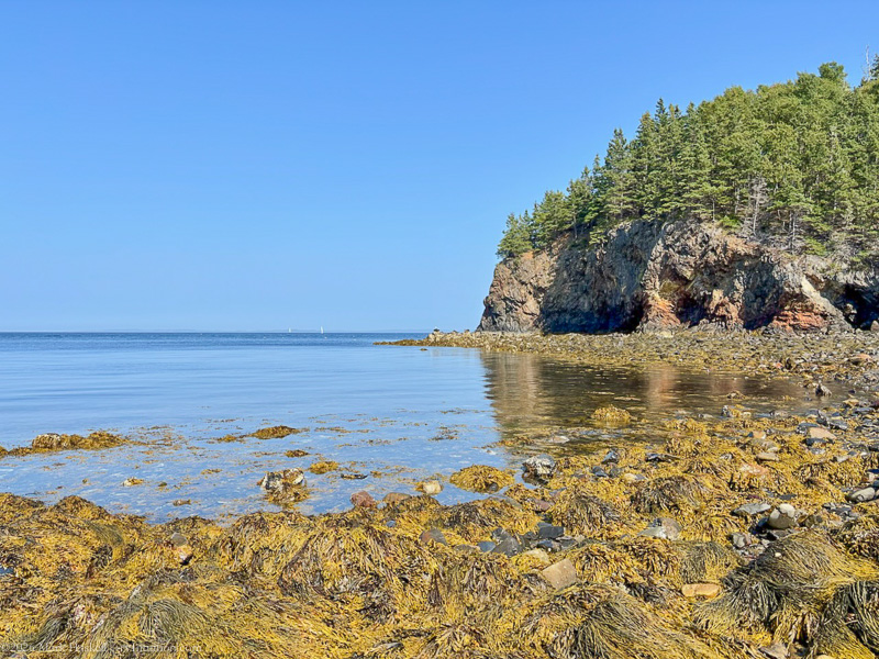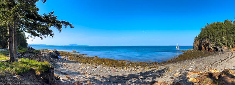 Children were exploring tide pools on the rocky beach. Owls Head rock can be seen towering over the sailboat on the right.