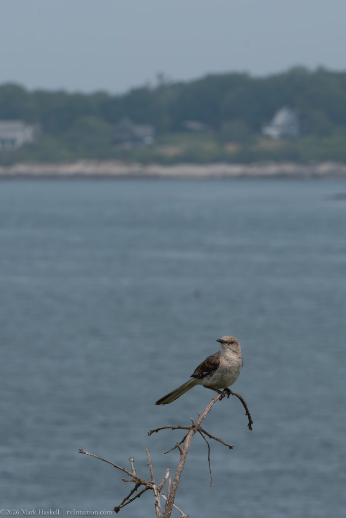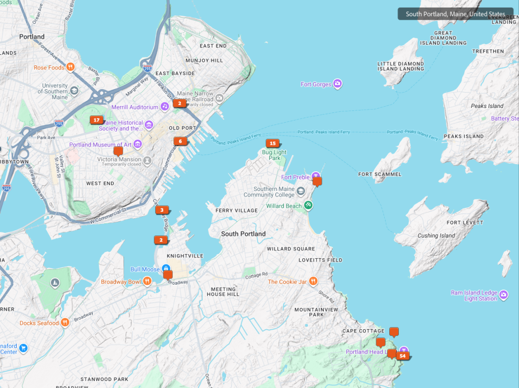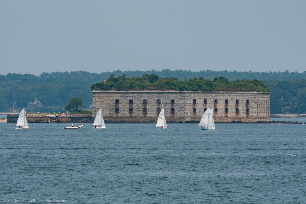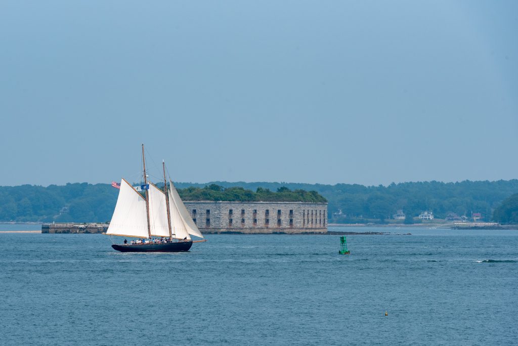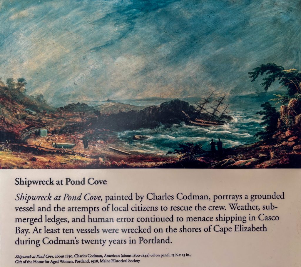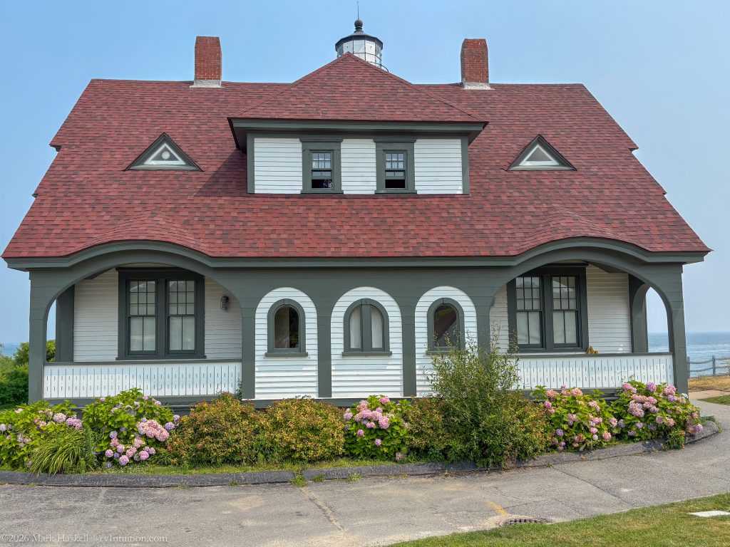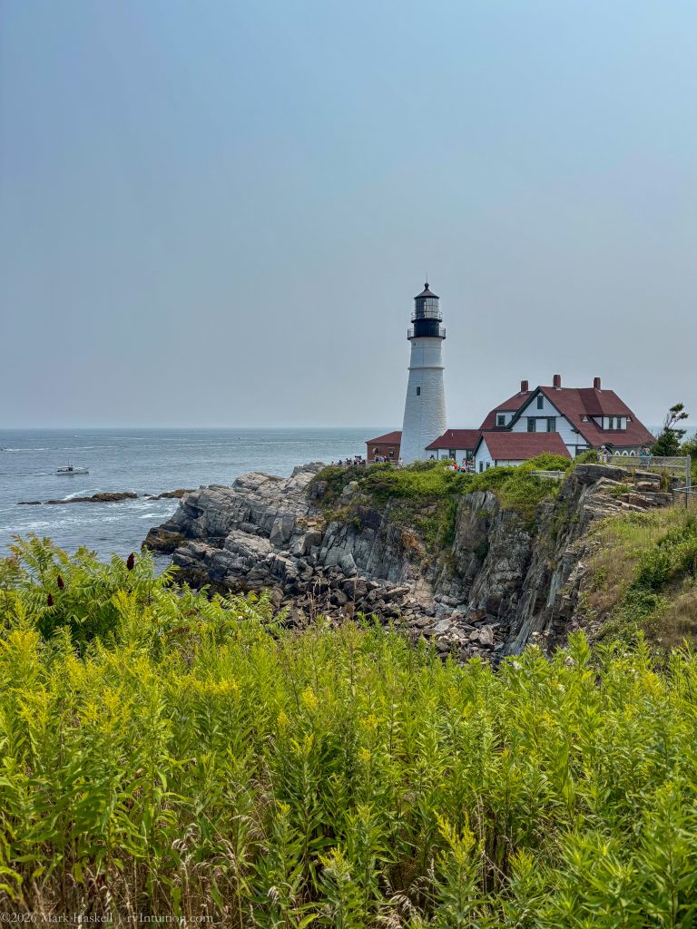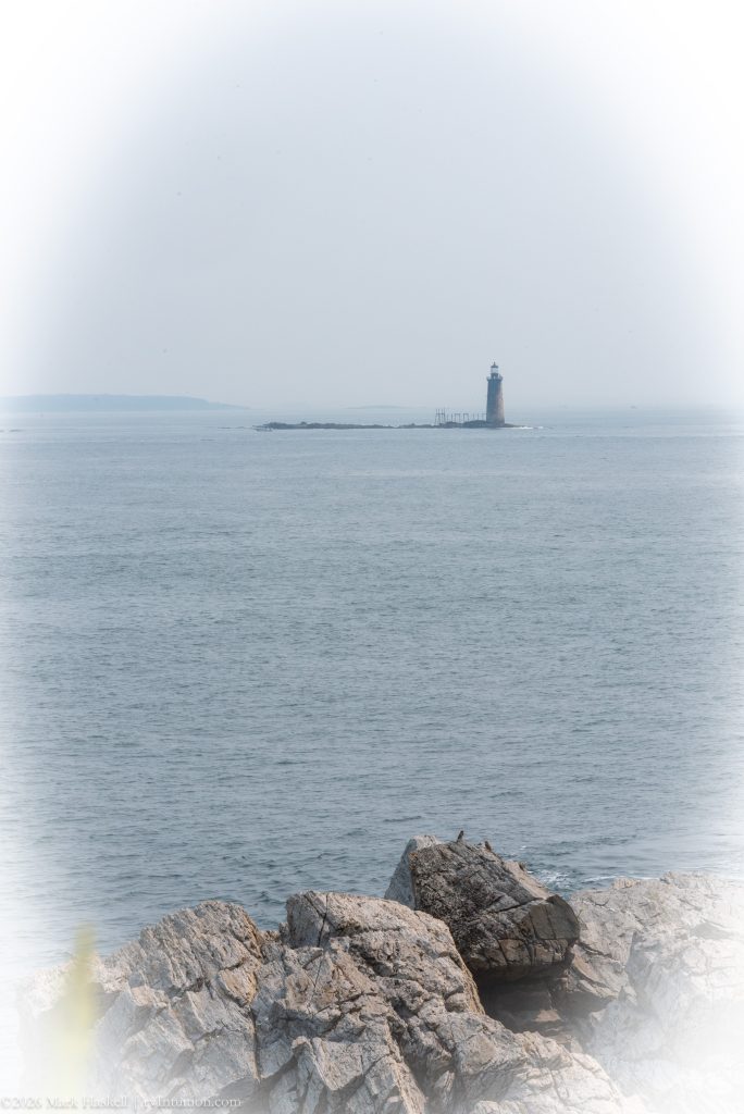 The northeastern side has been marked by the 72′ tall Ram Island Ledge Light since 1905. Despite haze from Canadian wildfire smoke, Ram Island was visible from Portland Head.