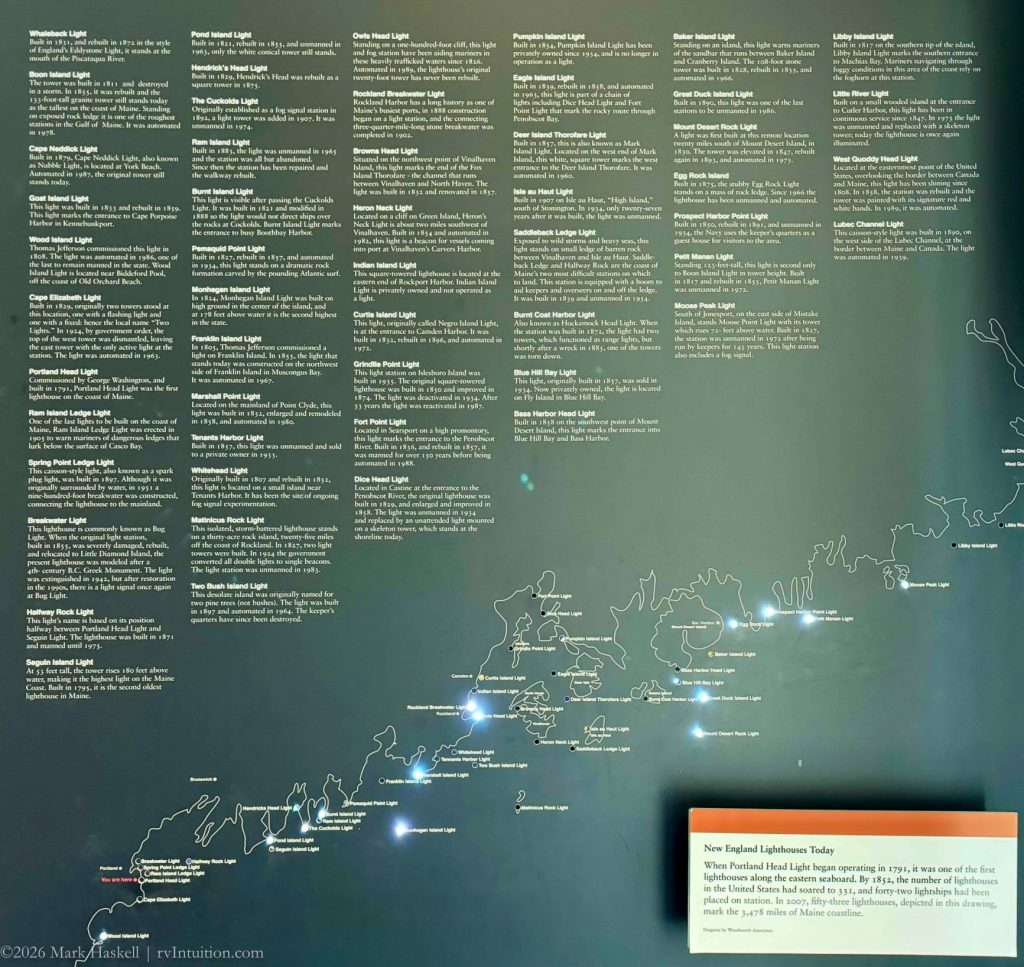 Lighthouse lovers need to visit Maine. This map shows the fifty-three lighthouses along the 3,478 miles of the Maine coast.