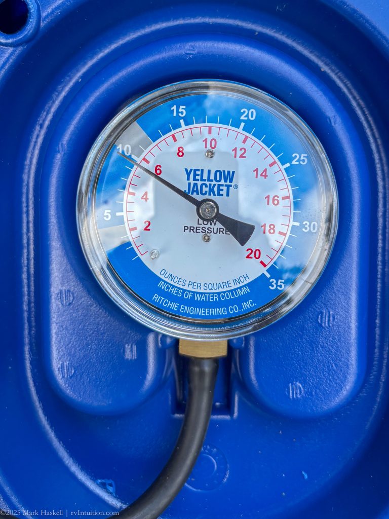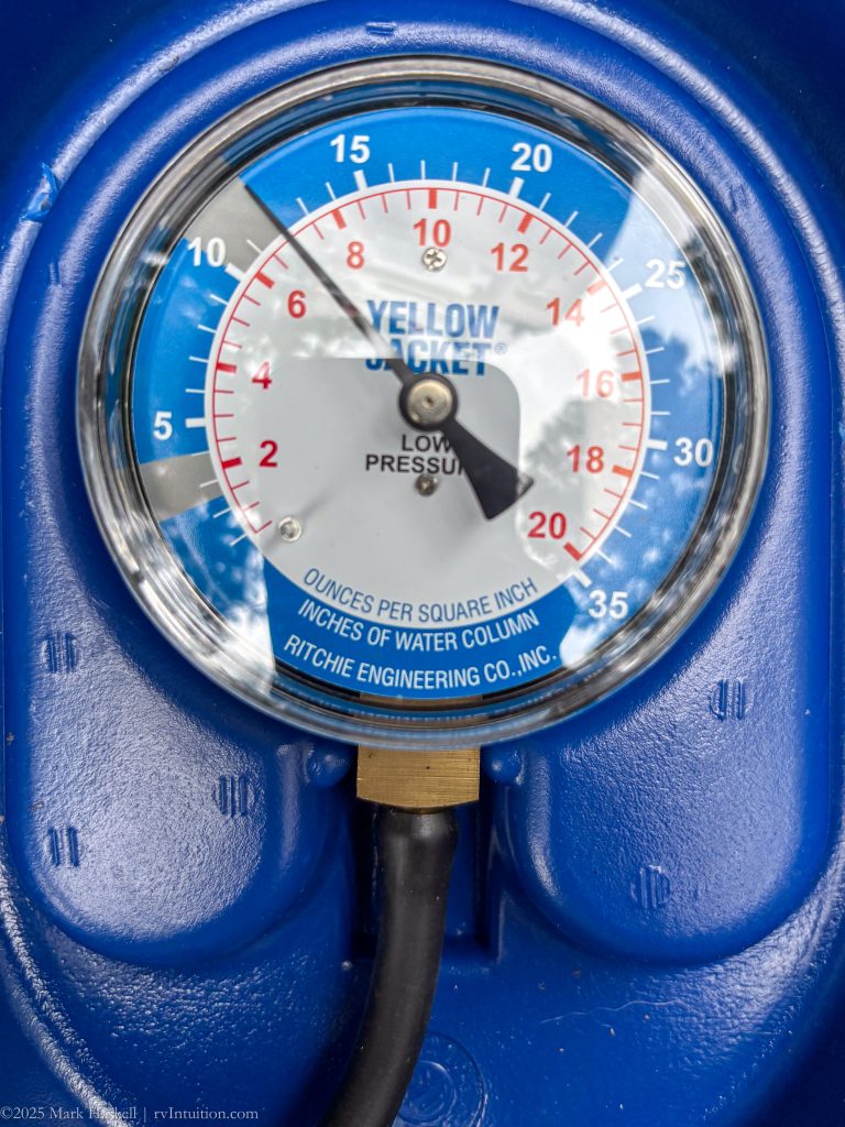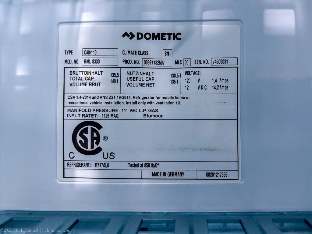 Cooling was fine on shore power or DC, so the first thing that we thought to check was the propane pressure. Dometic recommends at least 11 psi. Internet searches suggested looking on the back of the refrigerator to find the specifications. I used a flashlight and mirrors to look for the sticker on the outside back of the fridge. Of course, this sticker is readily visible on the back wall inside of our RML 8330.