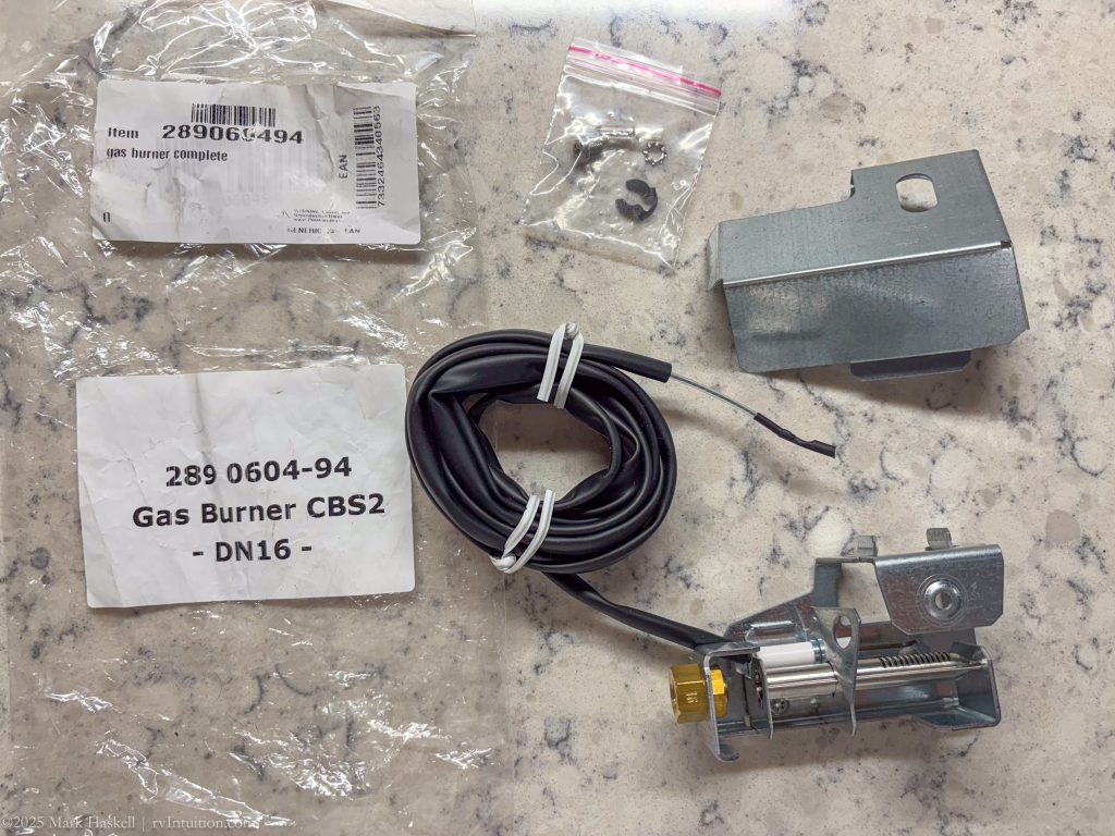 The new burner comes as part of this kit from Dometic. Sometimes parts are only available in Europe since the fridge was made in Germany, but we found the kit in Texas at United RV Parts. Here’s what we ordered: Dometic | OEM Refrigerator Gas Burner | 289060494 | Gas Burner with Ignitor Wiring. It was $249 in August of 2025.