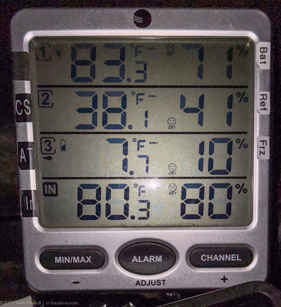 Temperature sensors showed the fridge at 38.1°F and the freezer at 7.7°F after running the refrigerator overnight on propane.