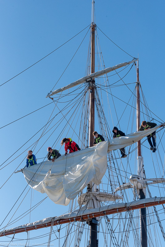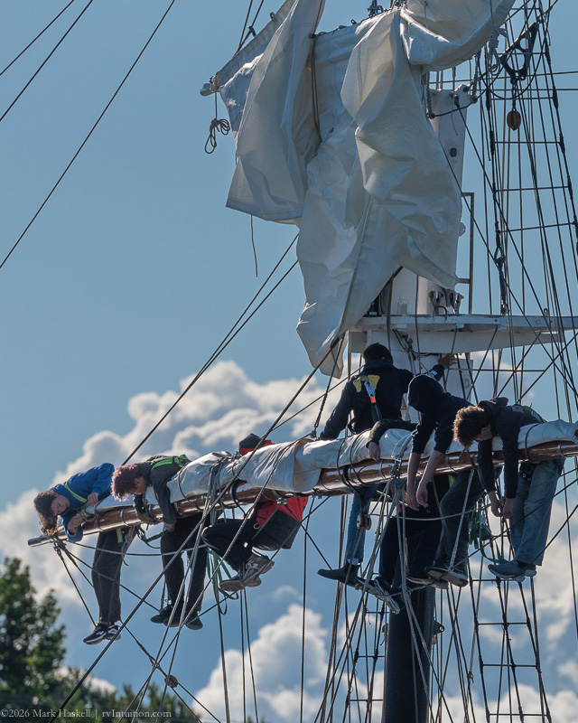 High school students were climbing the yardarms and furling the sails. Good balance is required to stand on ropes suspended high in the air.