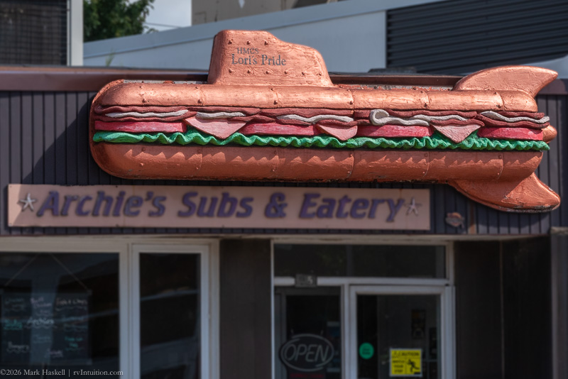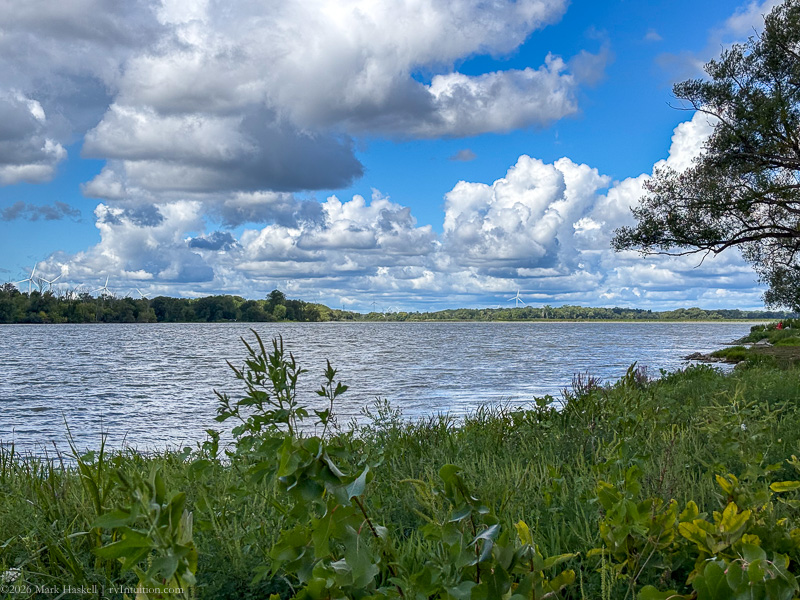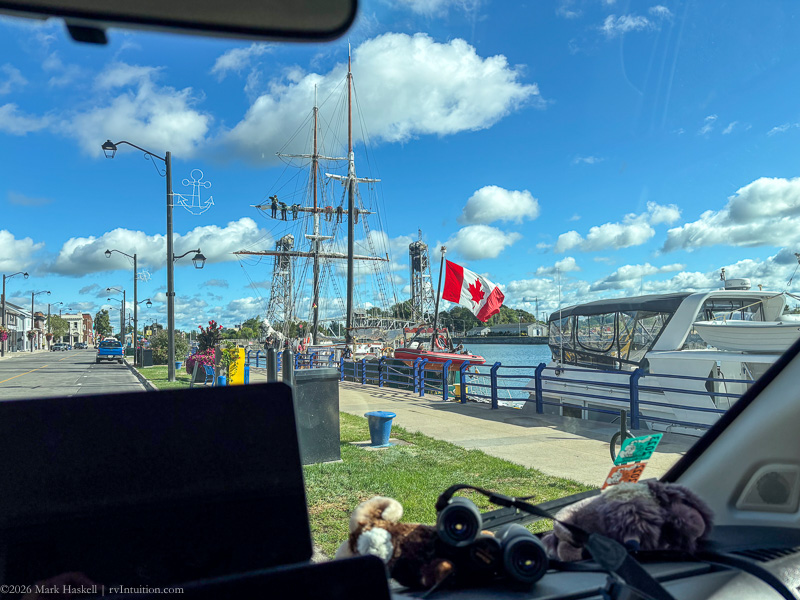 Parked alongside the Welland Canal. The canal connects Lakes Erie and Ontario, providing a route around Niagara Falls. While traversing the 27 mile canal, ships pass through eight locks to compensate for the 326 feet change in elevation between the two lakes.