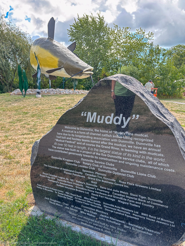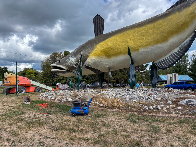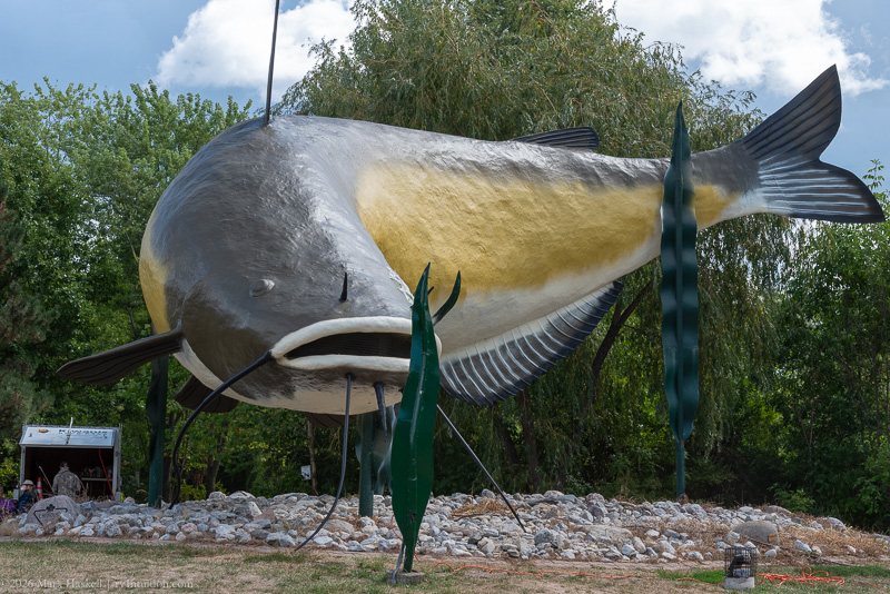 Made lunch in the van, then chatted with the crew restoring a statue of “the world’s largest catfish.” Left “Muddy” behind at 1147