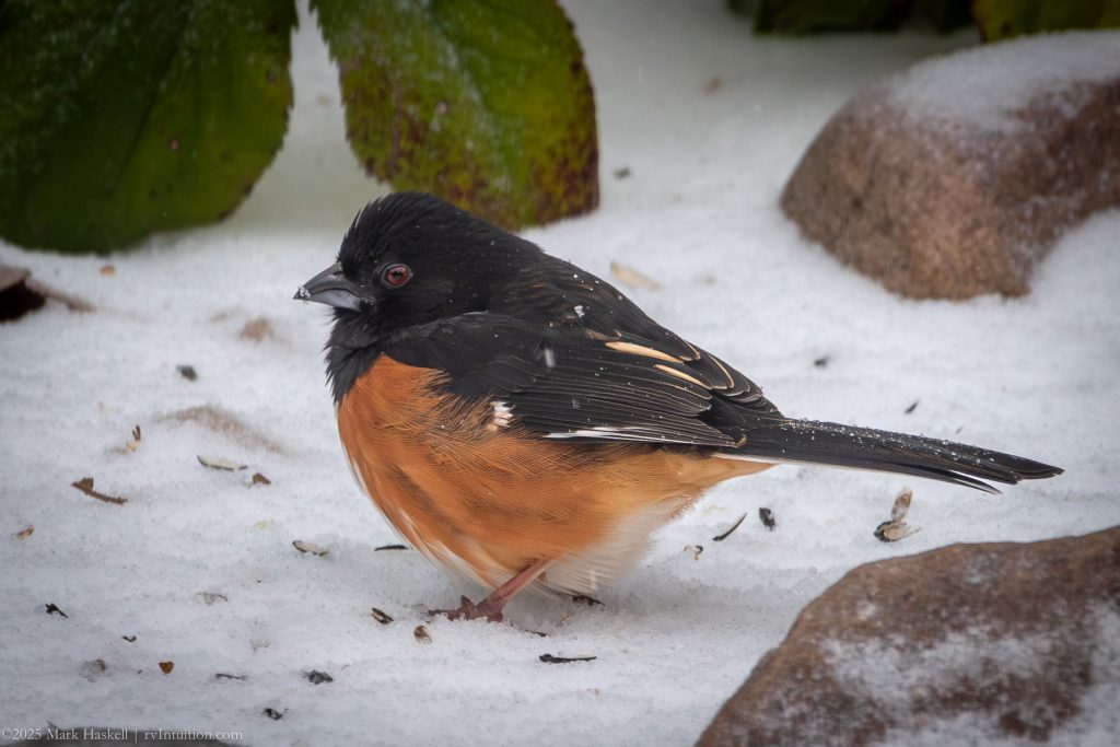 This Eastern Towhee had no problem finding food on top of the ice.