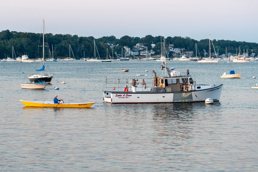 Watching boats provided great entertainment. The skiff “Rowdeo” passes the lobster boat “Sophie and Emma” on her mooring.