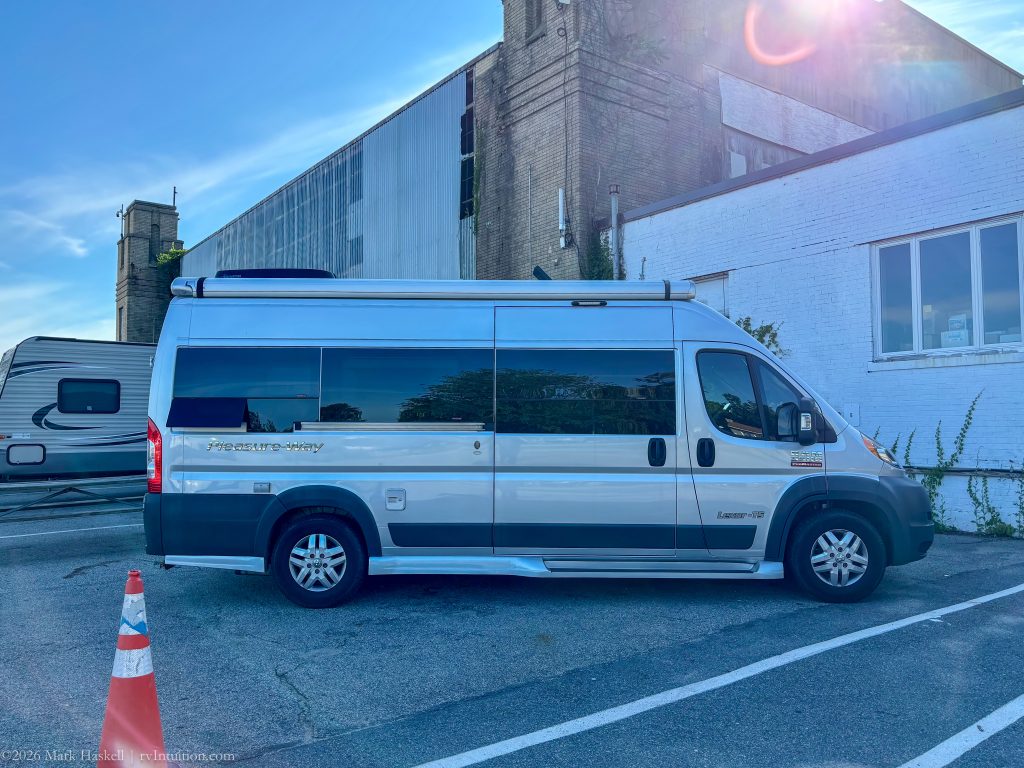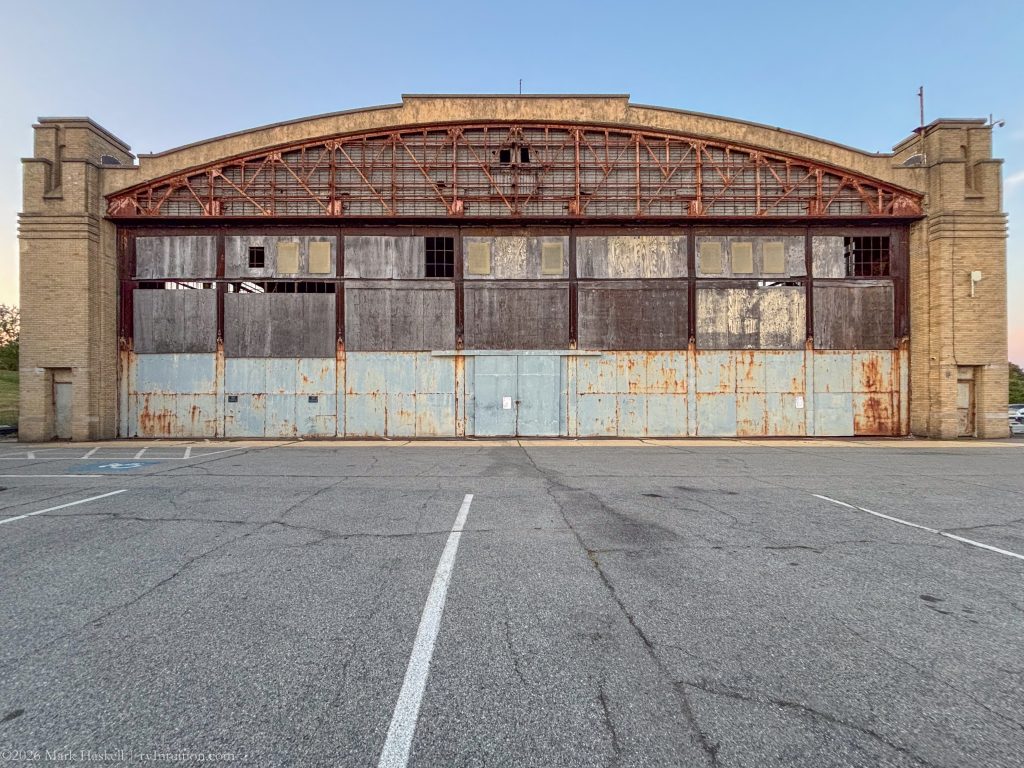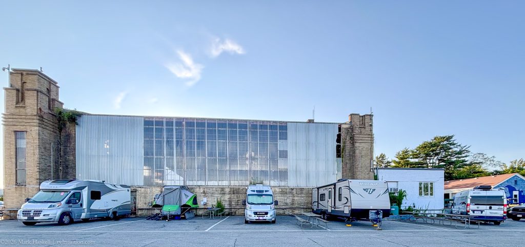 The east side of the building now provides five “campsites.” We hope that the facility can be restored and preserved. A vintage seaplane display in the hanger would be great. Note that we’re the rightmost of three ProMaster based RVs.