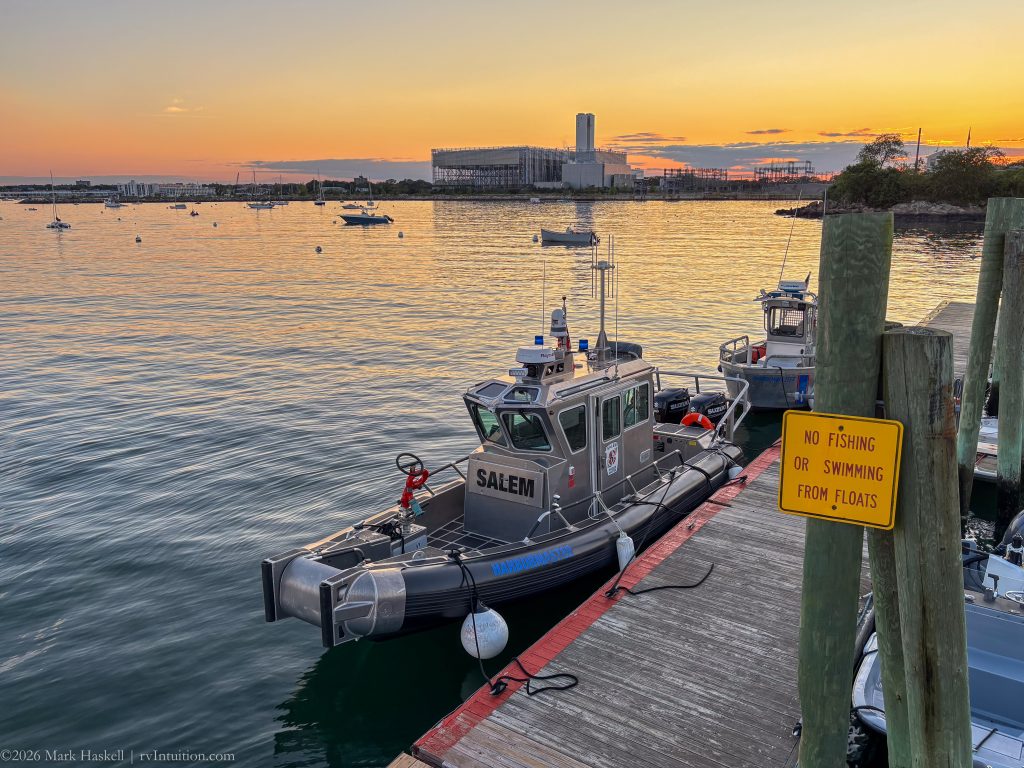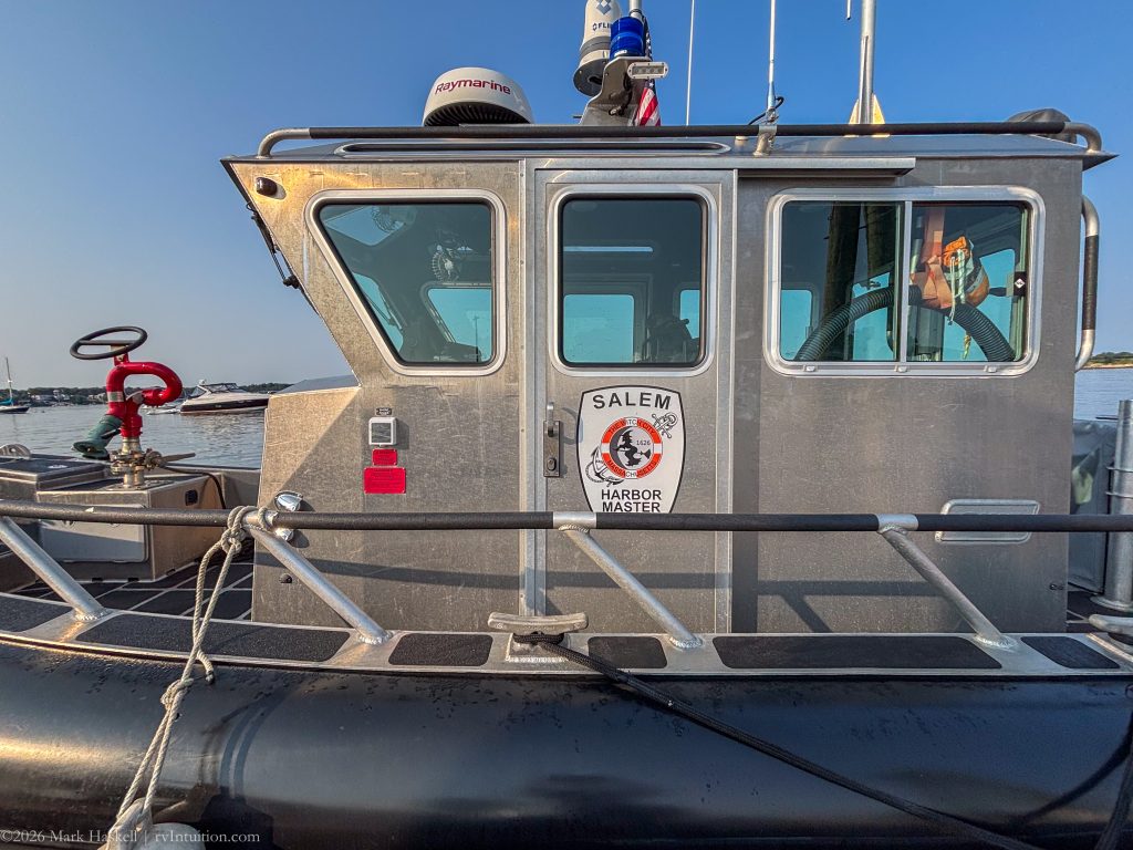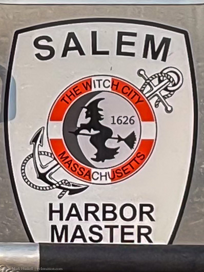 A floating dock provided easy tie-up before and after launching. We watched lobster boats unload and the Harbor Master make his rounds. Kudos to whoever designed the logo for the city of Salem!