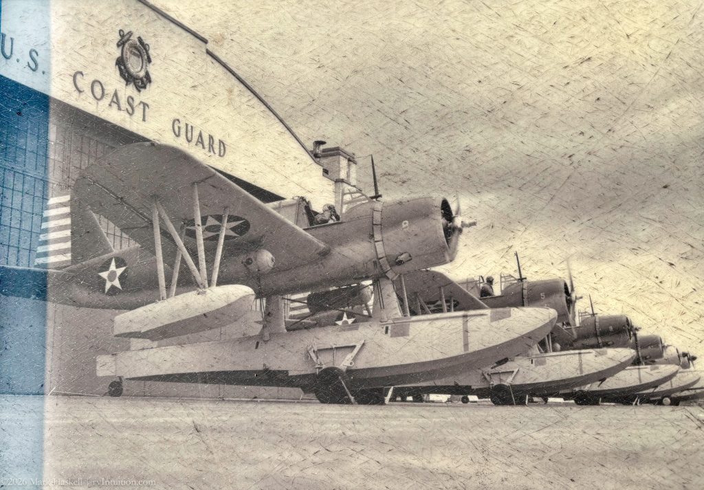 Thanks to Wikipedia, we learned that the Coast Guard base was open from 1935 through 1970 serving the area from the Canadian border to New York City. It was phased out as helicopters replaced seaplanes for search and rescue operations. The photo on the left is from signage at the park. The hanger same side of the building is shown as it looks today on the right.